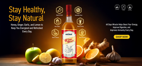 48 Days Miracle® is a natural product meticulously crafted from native, naturally grown ginger, garlic, and lemon juices, extracted without adding any water. These powerful ingredients are blended with premium Apple Cider Vinegar and slow-cooked in traditional clay pots over a wooden fire to retain their natural properties. After cooling, raw, unprocessed honey is added, creating a wholesome and effective daily wellness drink.